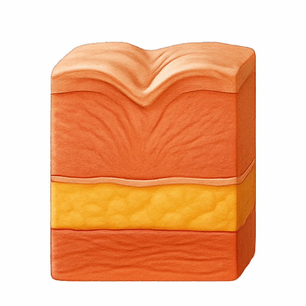 Las arrugas dinámicas se forman porque los músculos faciales se contraen repetidamente. En el corte transversal se observan fibras musculares activas bajo la piel que generan pliegues visibles en la superficie.